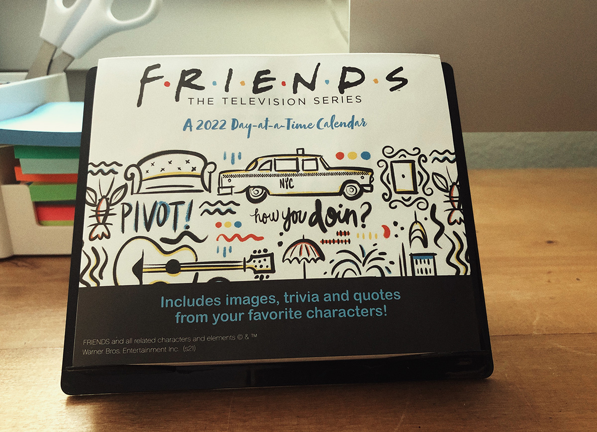书架上专门留了一格,摆放着老友记central perk咖啡馆乐高,还有全集十季的DVD,幕后花絮纪念书。让它们继续陪我前行。新年的每日一撕台历,也选择了老友记主题的。就连今晚拍跨年夜传统全家福,也穿了老友记周边衣服。(白天断网还看完了一整季的DVD…)