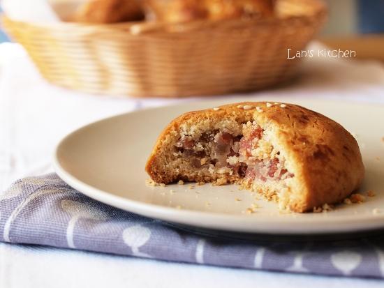 制作过程中全程戴了手套(因为要碰相机,还因为我怕油orz),可能有点影响造型环节。烤好后放到厨房纸巾上面吸油,足足三层厚的纸巾都浸透了。送了一个去德哥办公室给他吃,晚上回来跟我说这饼绝对是个calorie bomb,一个足以顶一下午。所以我都是配着普洱茶吃的,装模作样地喝下午茶吃月饼。小时候有一次跟着长辈去到糕点厂里,跟一个熟人直接买厂里刚出炉的月饼。我去到车间里看到一桌子上堆满的火腿丁,切火腿的那些人,一面切,一面吃,还给了我吃了一块。还看到他们拿起红印章给月饼盖印,云腿,五仁,洗沙,椰蓉……然后用纸皮把饼给包起来。我欢欢喜喜地提着一袋月饼回家。如今那些包装精美,价格骇人的月饼,真是好笑。资本主义啥都好,奏是木有云腿月饼。