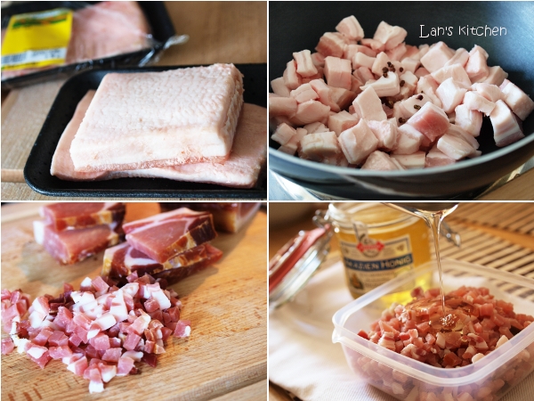 3-4,火腿300克切成绿豆大小的丁,用4-5勺蜂蜜拌匀腌制,放入冰箱保存一天。