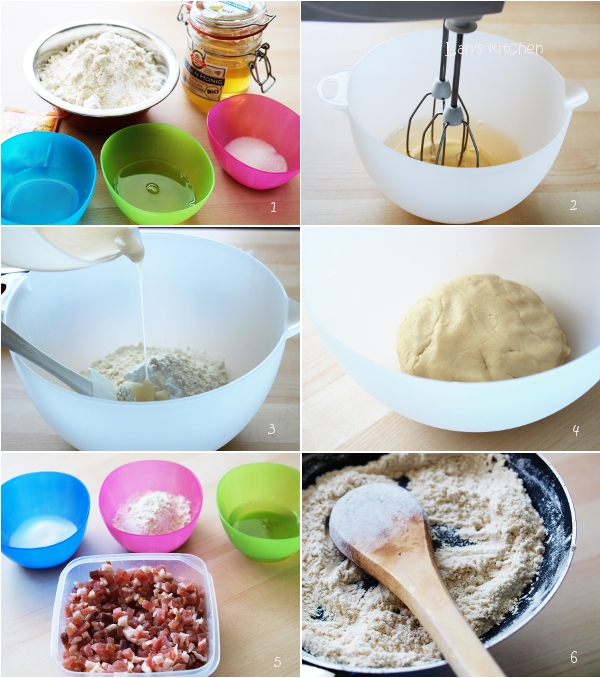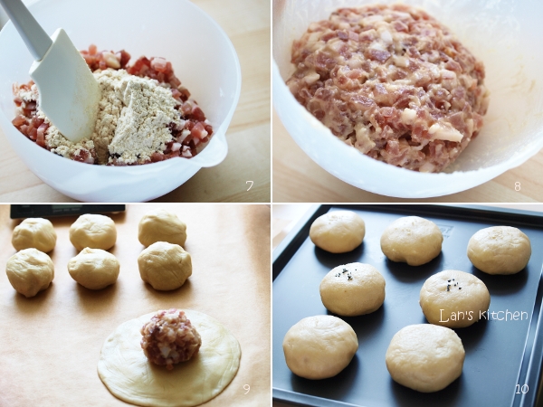 5,馅料所需材料:蜂蜜腌制过的火腿丁,白糖2勺,猪油100毫升,面粉5勺;