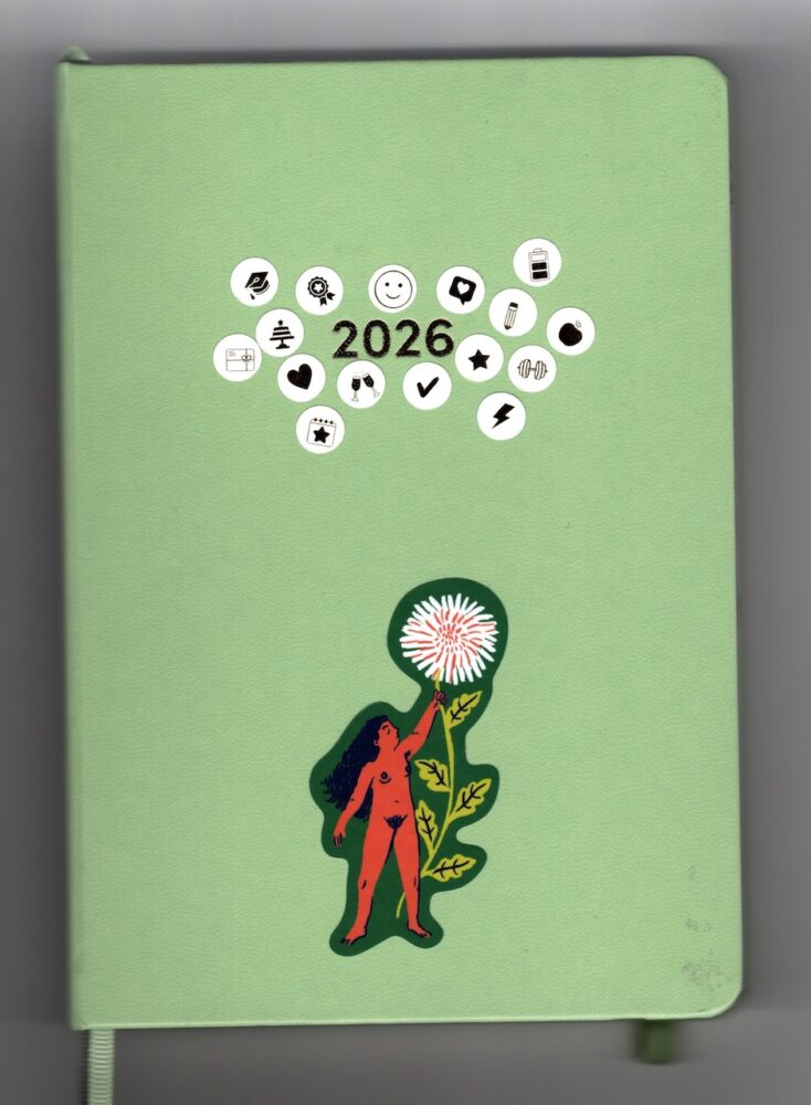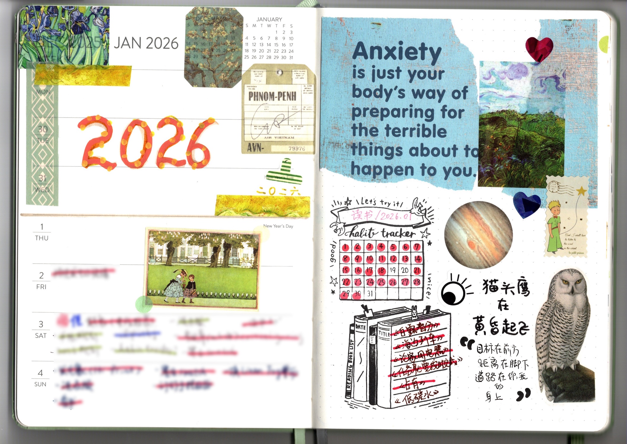 今年开辟了新玩法。本子还是用来安排待办事项,但页面上多了别的栏目,也多新的装饰:贴纸、印章、胶带,各种彩笔轮番上阵。本子除了工具属性还多了一层赏心悦目的价值,成了一个“创意渠道”,生出新意义。