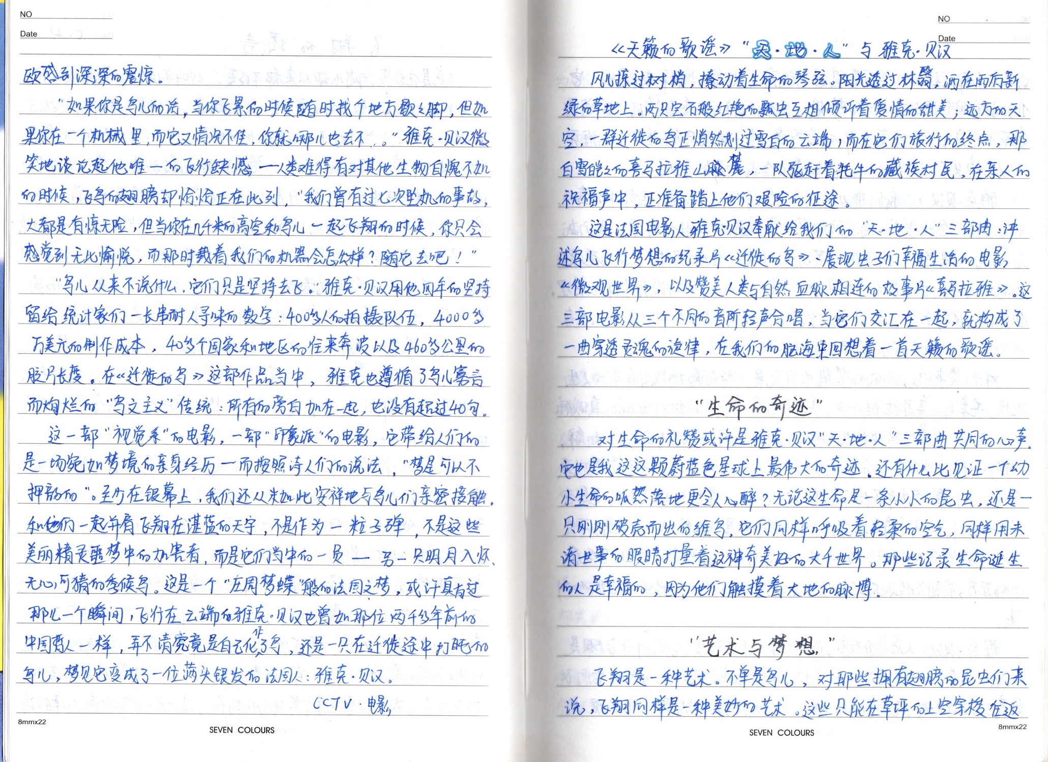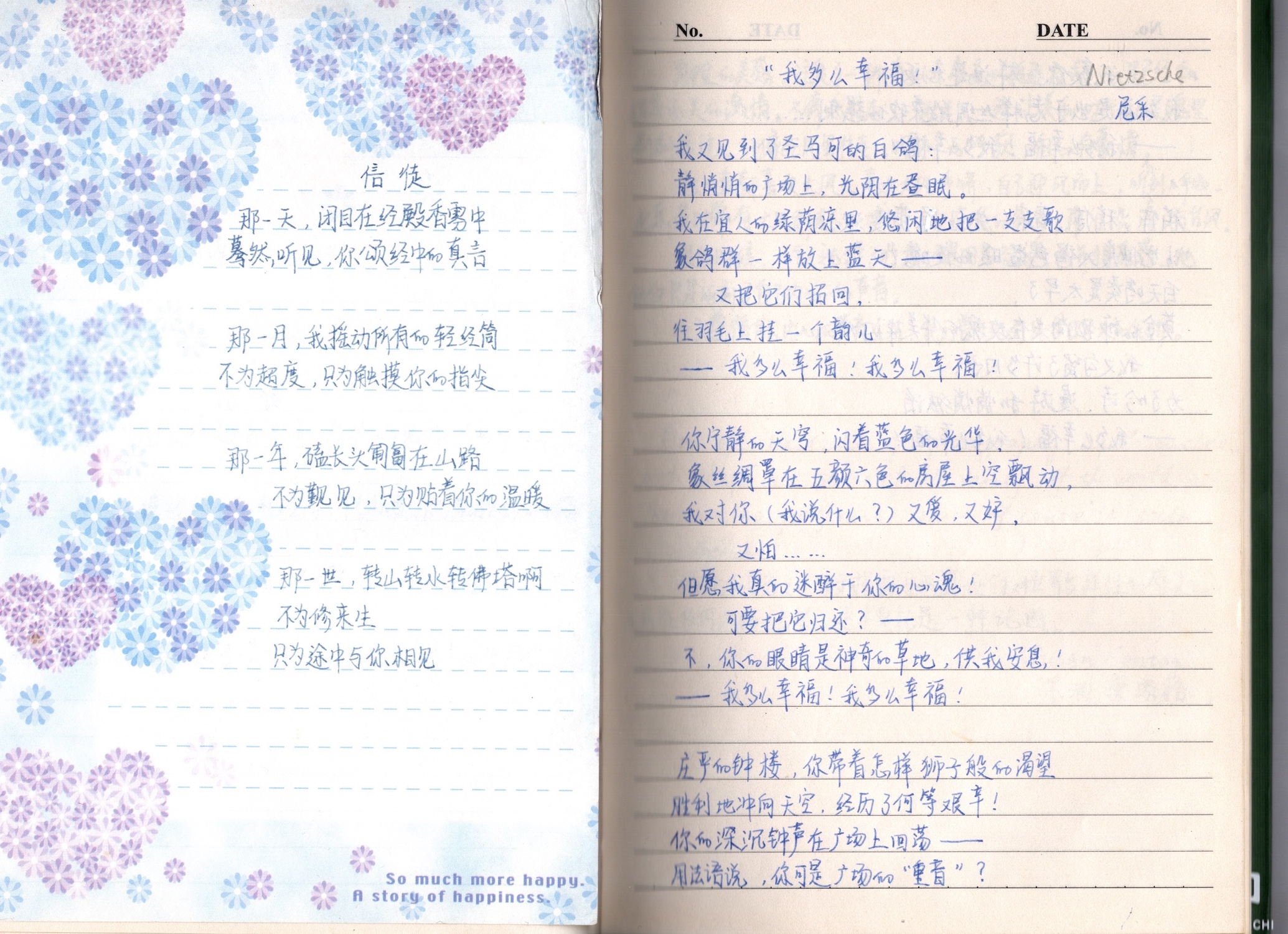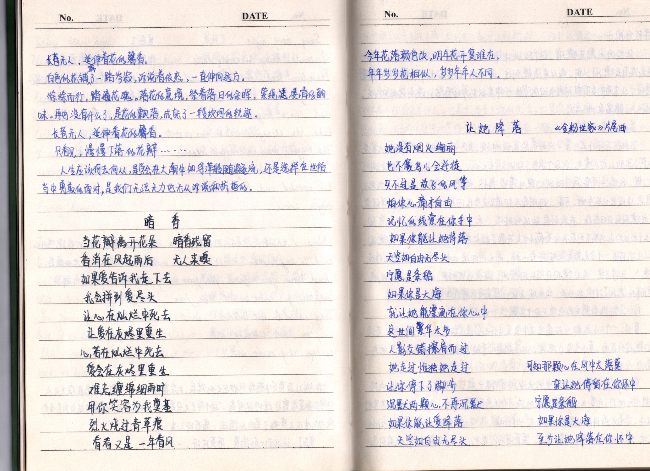那年的运动会我报名了跳绳,得了年级第一,奖品是一本塑料壳蓝色封面的笔记本,上面印着仙人掌的图片,以及“日记”二字,这是我有记忆以来,第一次靠自己实力赢得的奖品。(似乎只要在学校获得什么奖励,奖品都是笔记本这类的学习用品。)到了高中,有个叫“七彩SEVEN COLOURS”的文具品牌,做的笔记本都挺好看,纯色压纹封面,摸起来很有质感。我有一本深绿色的,用来抄歌词、抄文章,偶尔夹一些剪报,已经不会贴贴纸,就纯字手帐,高中三年加上大学,从第一页到最后一页,满满当当。高三班主任政治老师会在每次摸底考后,给前几名的同学自费买笔记本,也是七彩的。有次我考试得了班级第四,老师给了我一本深蓝色的笔记本,我用来摘抄各种游记,特别是德国相关的(可能是为了自我激励努力考上德语系吧)。那本本子还剩三分之一没写完。老师写在扉页的“望再接再厉”还没褪色。这两本我一直带在身边。